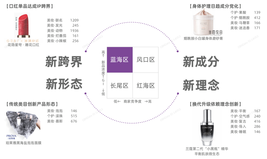 創新的維度是多種多樣的,對于美妝洗護品類來說,尤其如此。根據阿里媽媽、天貓發布alimama insight《后風險時代的中的紅海突圍與藍海發掘》等綜合資訊表明,新成分、新跨界、新形態、新理念四個維度探索有效的需求創新溝通點。