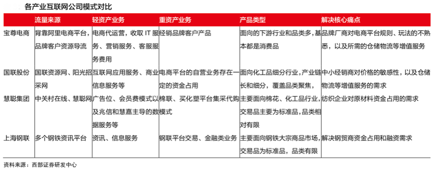 B2B產業互聯網,深度解決產業問題,方有大平臺大未來。縱觀國內產業網經營現狀,根據西部證券研發中心等綜合資訊表明,產業互聯網多數介入到“電商交易”環節,自營業務與平臺業務并存,圍繞產業鏈提供產品銷售交易之外的更多元化的服務,例如:物流倉儲、營銷管理、IT 解決方案等,深度解決產業采購難題,降低企業采購成本,提升產業運營效率。