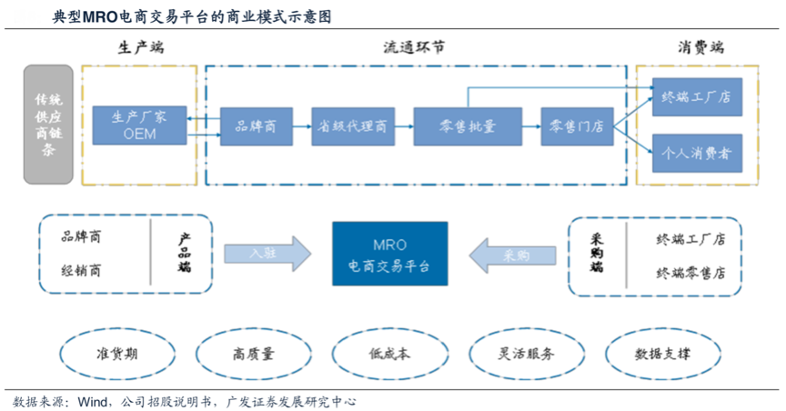 產業互聯網的商業模式有其固定的產業價值,其更多以“產業鏈效率提升”為導向,連接產品端和采購端,提供高質量、準貨期、低成本的產業平臺級服務。根據wind、公司招股說明書、廣發證券發展研究中心等綜合資訊表明,典型的MRO平臺的商業模式重點在于連接產品銷售和產品采購兩大端口,主要對于貨品的責任系保養(Maintenance)、維修(Repair)和運營(Operation),多存在于非生產原料性質的工業用品,這個過程當中平臺方的核心能力體現在需要做到匹配貨 期、高質量、低成本、靈活服務和相應完整的數據支撐。