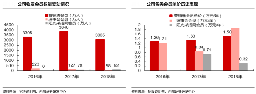 經典案例:根據公司招股說明書、西部證券研發中心等綜合資訊表明,通過國聯網行業網站集群,公司提供的收費會員有營銷通會員、行業理事會會員和陽光采購網會員,通過收取會員費來實現收入和盈利。2018年公司營銷通會員數為 3065 萬,理事會會員和陽光采購網會員為 58 和 92 萬人,總體數量保持平穩。