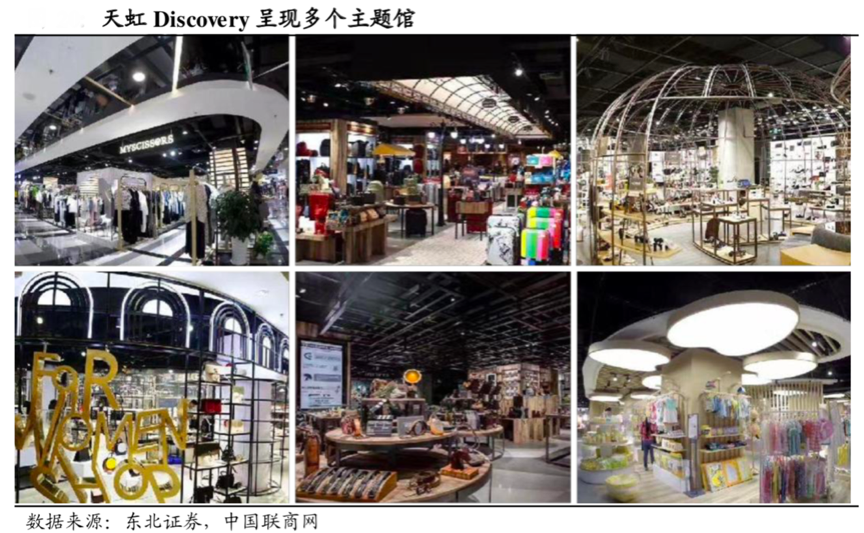 經典案例:據東北證券、中國聯商網等綜合資訊顯示,天虹Discovery將目標客群定位為 80 后力量女性,打造了五大品類集合館(美妝館、鞋履館、內衣館、兒童館、運動館)和六個生活方式主題館(旅行館、女士精品館、男士精品館、OFFICE女裝集合館、RELAX 女裝集合館、Beself 家居生活館);并打破擁擠、品類雜亂、柜柜分離的傳統百貨模式,形成了同類商品高度集合、精品選搭配套的新業態商場。