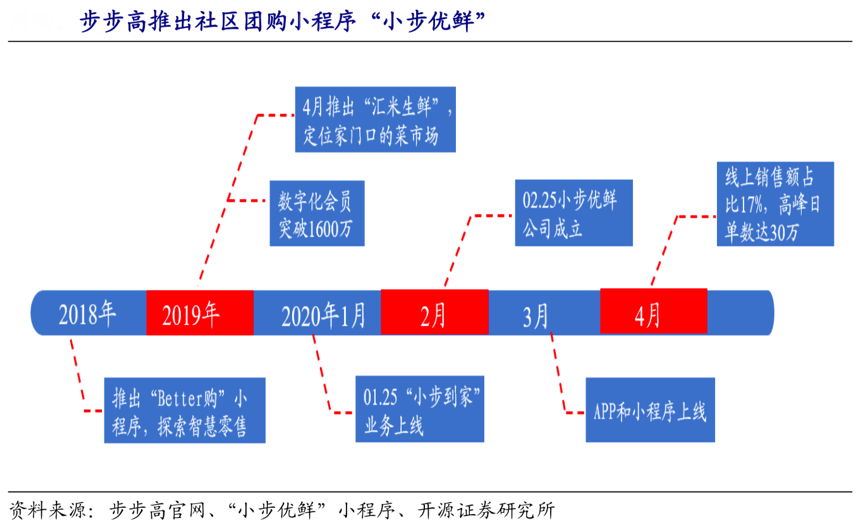 經典案例:根據步步高官網、“小步優鮮”小程序、開源證券研究所等綜合資訊表明,2019年,步步高開始數 字化轉型,“以用戶為中心”,加強以生鮮為核心的供應鏈體系。2020 年 1 月 25 日,“小步到家”業 務正式上線,將智慧零售觸角深入社區。2 月 25 日,全資子公司——湖南小步優鮮 商業有限公司注冊成立,此后其推出社區團購 APP 和小程序“小步優鮮”,正式入局社區團 購市場的角逐。