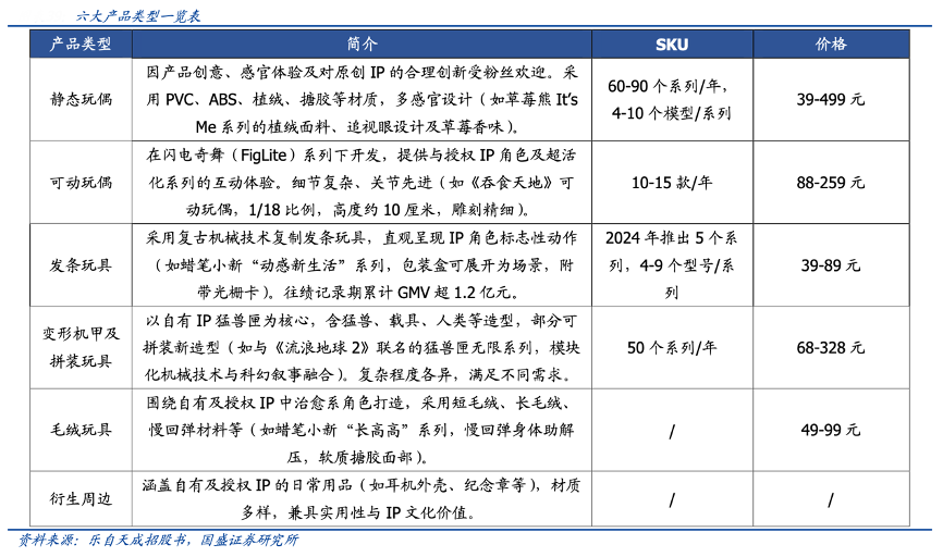 經(jīng)典案例:根據(jù)樂自天成招股書、國盛證券研究所等綜合資訊表明,樂自天成公司依托自有及授權(quán) IP 資源,打造了涵蓋六大品類的玩具產(chǎn)品體系。52TOYS 品牌通過系統(tǒng)化產(chǎn)品布局,已形成包括靜態(tài)玩偶、可動玩偶、發(fā)條玩具、變形機甲及拼裝玩具、毛絨玩具、衍生周邊在內(nèi)的完整產(chǎn)品矩陣。