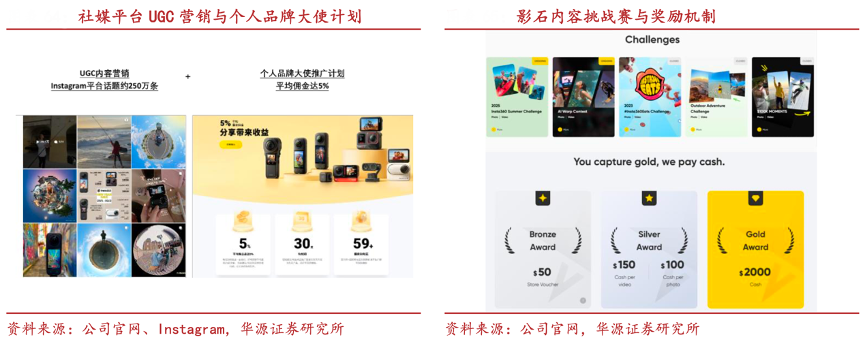 經典案例:根據公司官網、Instagram、華源證券研究所等綜合資訊表明,影石多元激勵機制助力營銷裂變,推動用戶從消費者向品牌共創者轉化。如“UGC 內容挑戰賽”,定期限時發起“高光時刻挑戰賽”、“世界探險大玩家”等主題挑戰,優秀作品可獲得平臺曝光、現金獎勵或新品試用資格。
