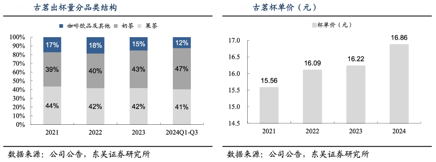 經典案例:根據公司公告、東吳證券研究所等綜合資訊表明,古茗聚焦大眾現制茶飲市場,產品以果茶(含果蔬汁)、奶茶(含輕乳茶)和咖啡及其他(含純茶、酸奶奶昔、烘焙和周邊等)為主,2024Q1-3 果茶/奶茶/咖啡及其他出杯量占比為 41%/47%/12%,輕乳茶帶動奶茶占比提升,產品定價穩定在 10—18 元區 間。
