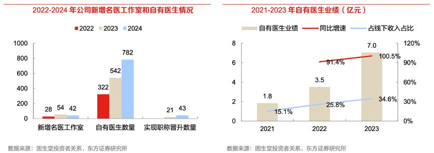 經典案例:根據固生堂投資者關系、東方證券研究所等綜合資訊表明,固生堂公司通過名醫傳承工作室的建設,讓自有青年醫生與名老中醫建立“師帶徒”關系,跟隨大師抄方學習,實現中醫學術思想和臨床經驗傳承和快速成長。 2022-2024年,自有醫生數量及實現職稱晉升數量不斷增加,助力業績增長。2023 年,自有醫生業績達 7 億元(+100.5%),線下占比達 34.6%。