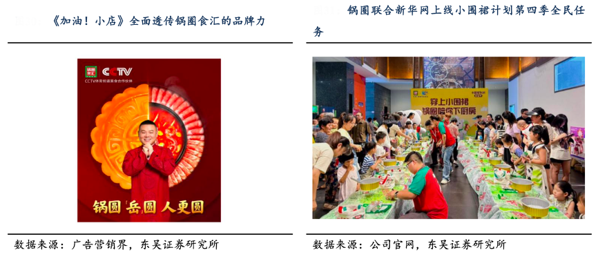 經(jīng)典案例:根據(jù)廣告營銷界、公司官網(wǎng)、東吳證券研究所等綜合資訊表明,鍋圈公司通過代言人、官方渠道和綜藝節(jié)目植入廣告等持續(xù)深化品牌在消費者群體中的心智認知,2022年公司精準鎖定《加油!小店》和《暖暖的火鍋》兩檔衛(wèi)視熱門綜藝,以此建立年輕大眾化溝通陣地;2024 年 7 月公司聯(lián) 合新華網(wǎng)上線暑期檔全民任務——小圍裙計劃第四季。