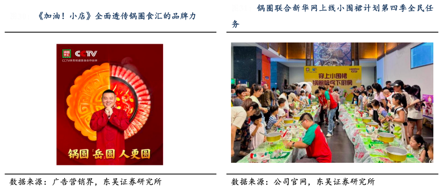 經典案例:根據廣告營銷界、公司官網、東吳證券研究所等綜合資訊表明,2021 年鍋圈食匯成為 CCTV 體育頻道的美食合作伙伴;2022 年公司精準鎖定《加油!小店》和 《暖暖的火鍋》兩檔衛視熱門綜藝,以此建立年輕大眾化溝通陣地;2024 年 7 月公司聯 合新華網上線暑期檔全民任務——小圍裙計劃第四季。